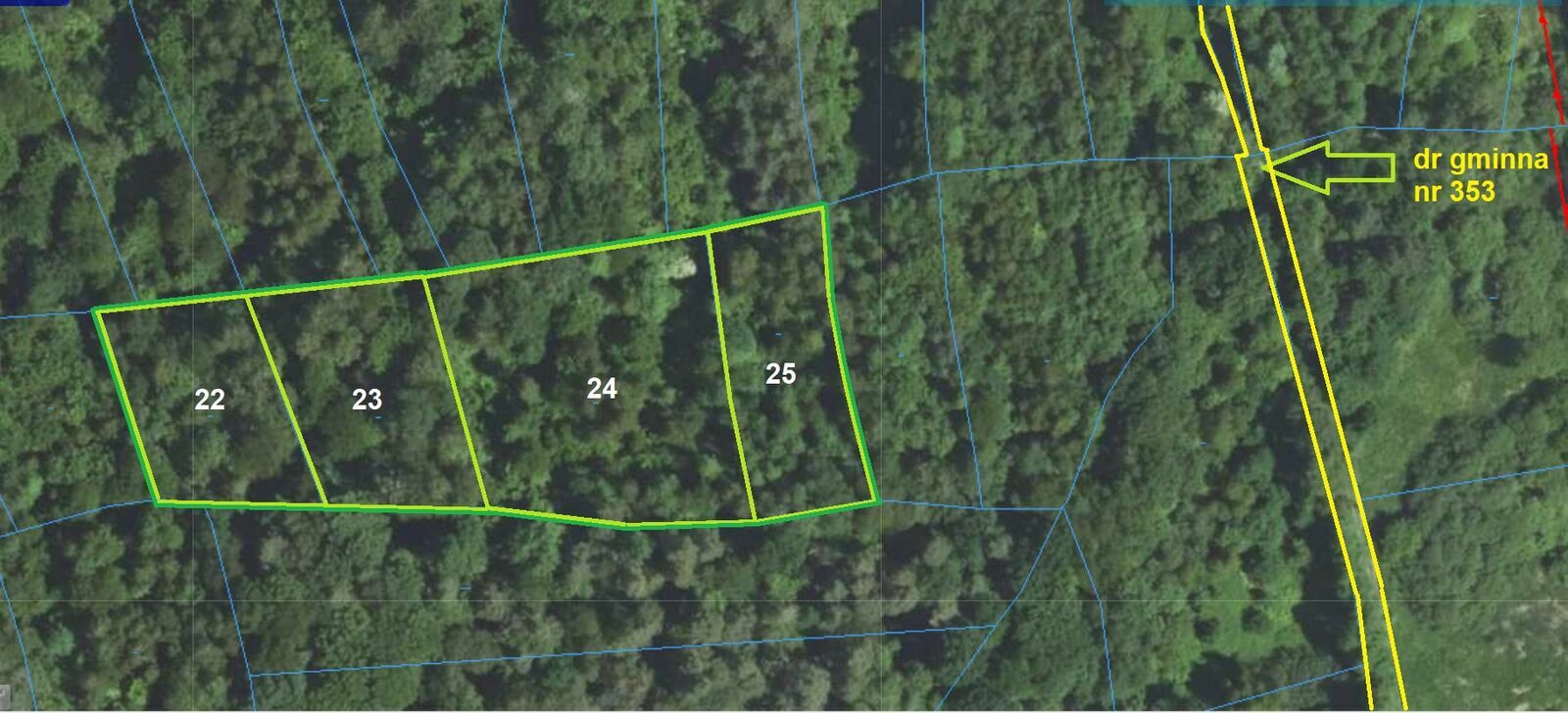 Działki zbliżone do prostokąta, nieogrodzone. Są to działki leśne oznaczone jako Ls IV i Ls IV. Cena 34 000 zł jest wystawiona za wszystkie cztery działki o łącznym areale 68 arów. Istnieje możliwość sprzedaży każdej działki osobno.